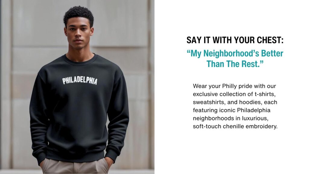Every summer while vending for Tote Jawn, people constantly ask us if we sell t-shirts. So, our signature soft-touch chenille embroidery neighborhoods are now available on t-shirts, sweatshirts, and hoodies!