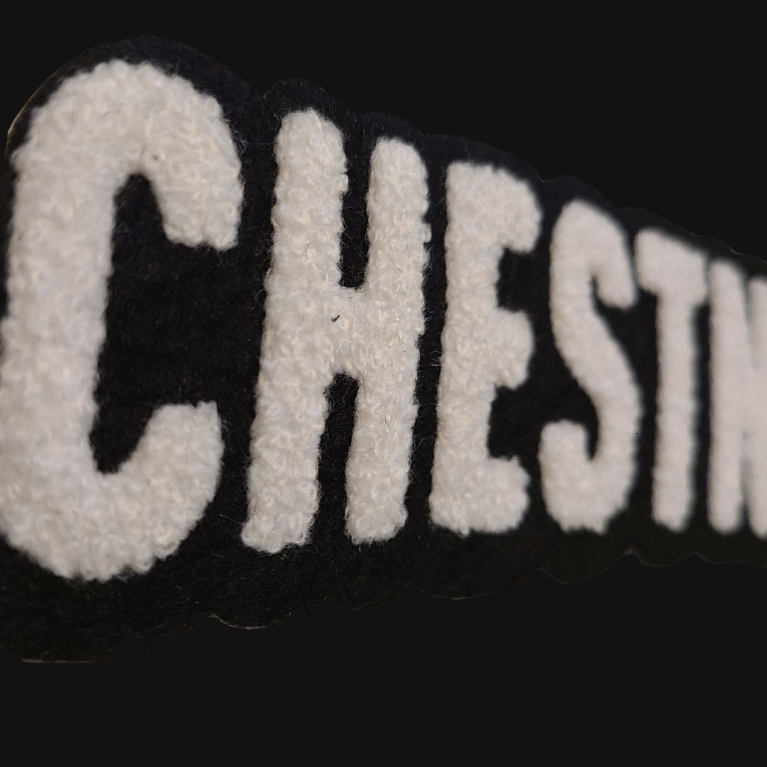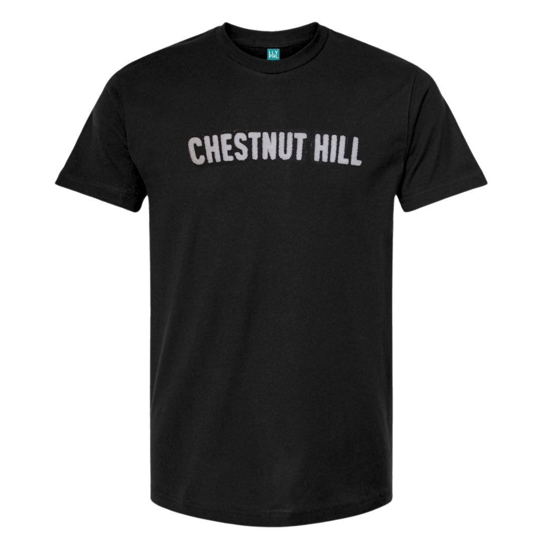 Unisex cut black t-shirt with “Chestnut Hill” in our standard font on the chest in soft-touch chenille embroidered patch.