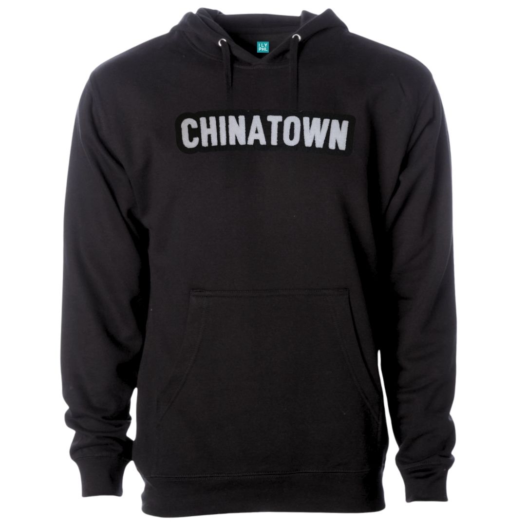 Unisex Black Hooded Sweatshirt with “Chinatown” in a soft, chenille embroidered patch.