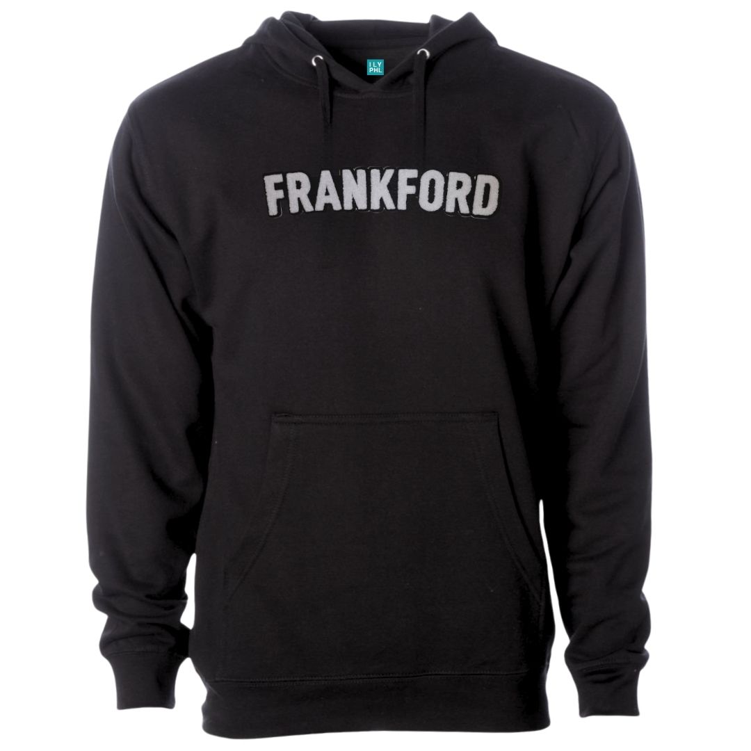 Unisex Black Hooded Sweatshirt with “Frankford” in a soft, chenille embroidered patch.