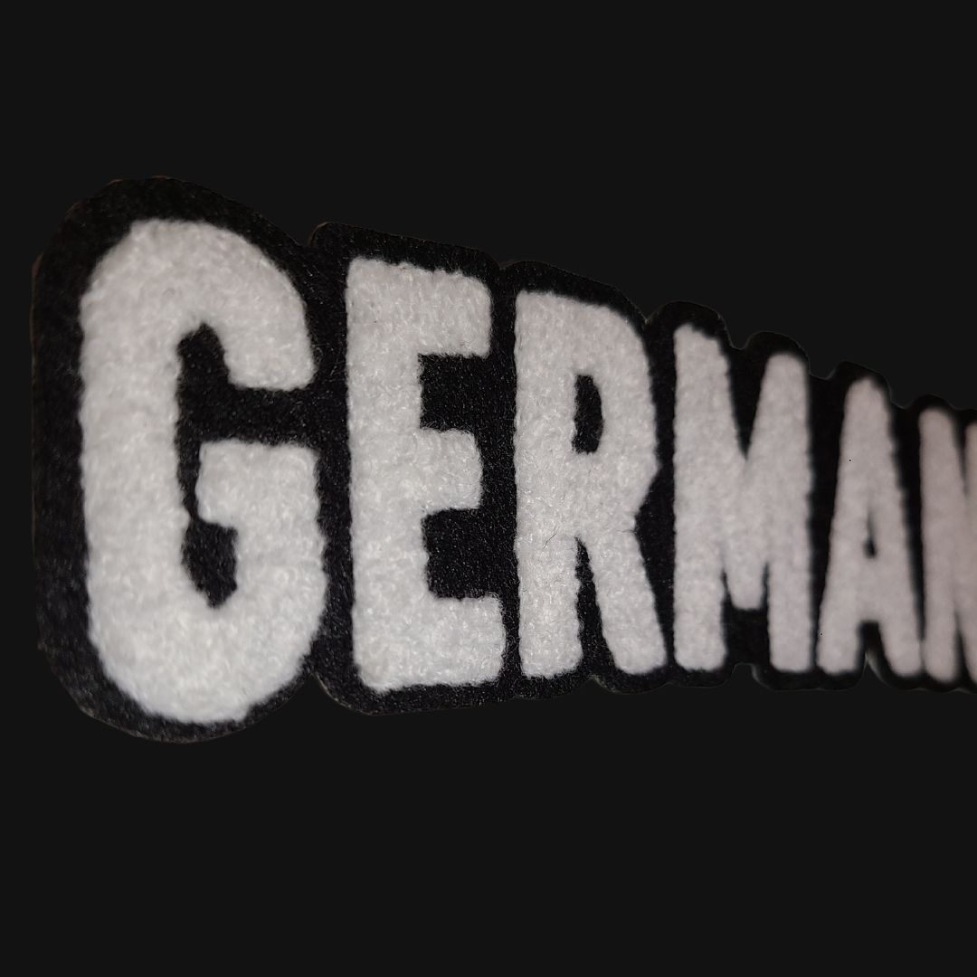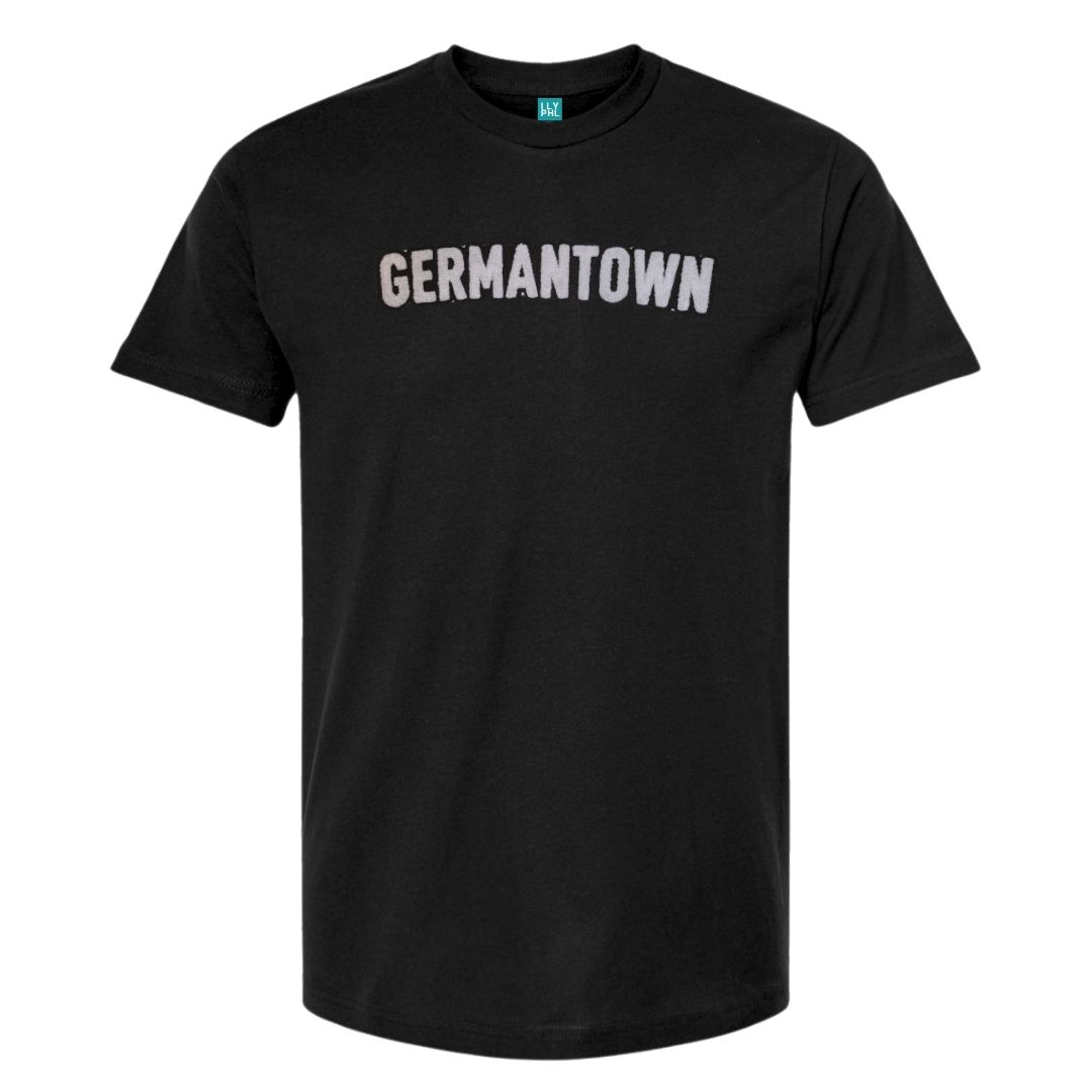 Unisex cut black t-shirt with “Germantown” in our standard font on the chest in soft-touch chenille embroidered patch.