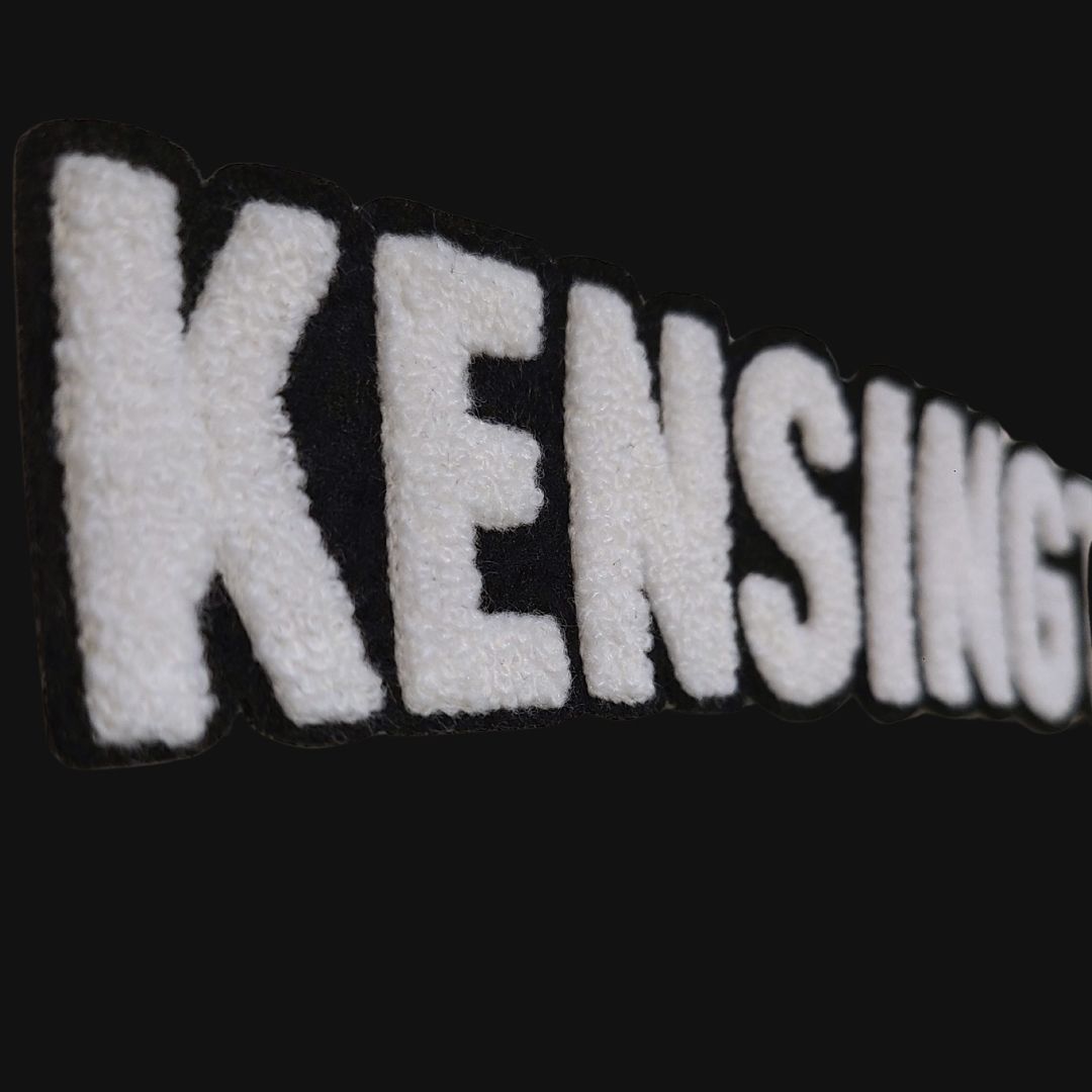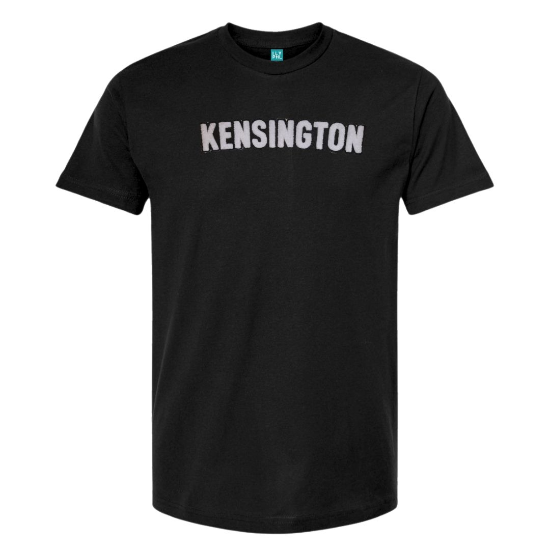 Unisex cut black t-shirt with “Kensington” in our standard font on the chest in soft-touch chenille embroidered patch.