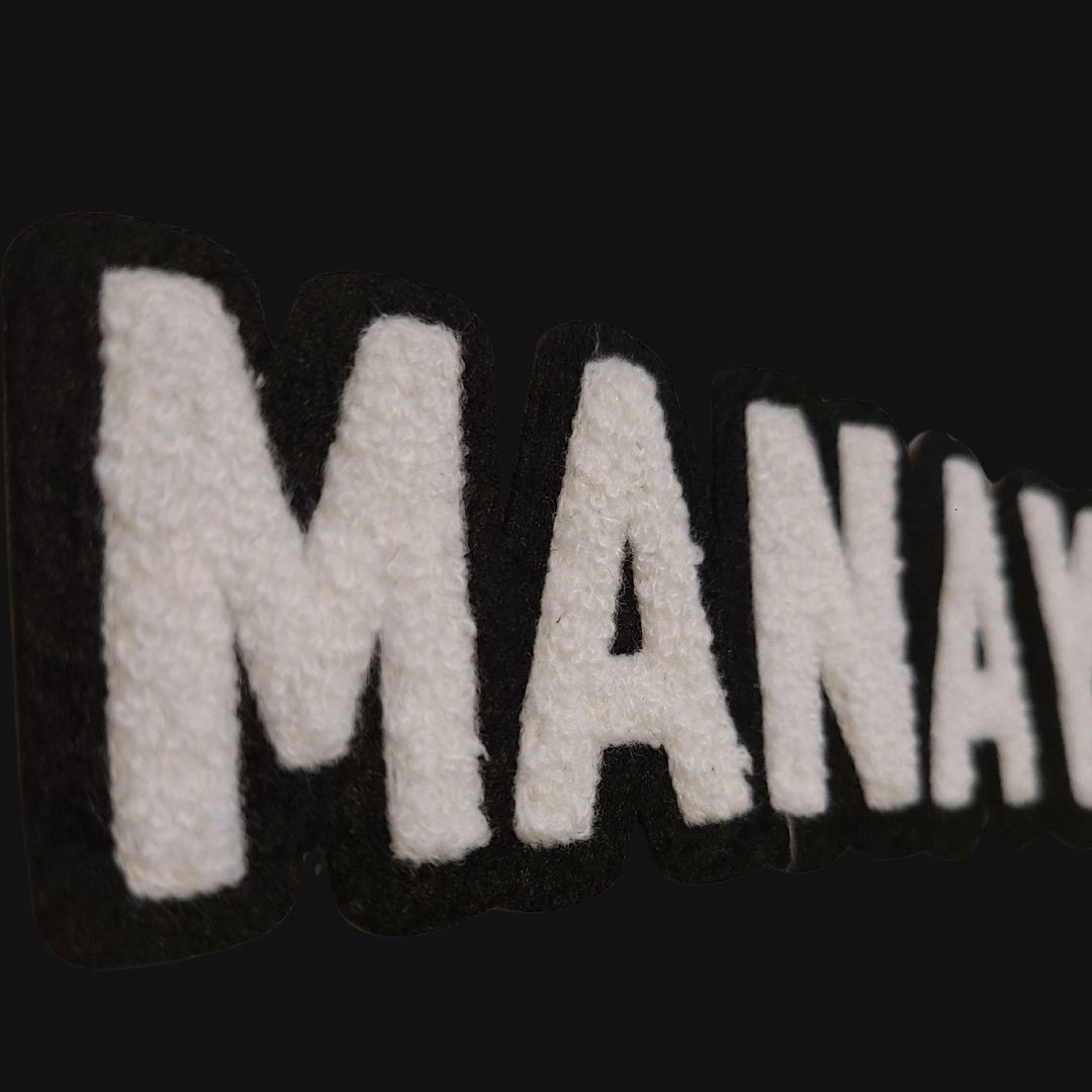 Unisex black crewneck sweatshirt with “Manayunk” in a soft, chenille embroidered patch.