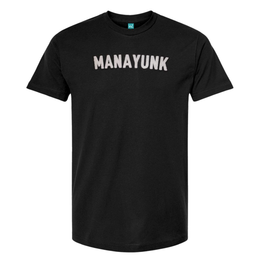 Unisex cut black t-shirt with “Manayunk” in our standard font on the chest in soft-touch chenille embroidered patch.