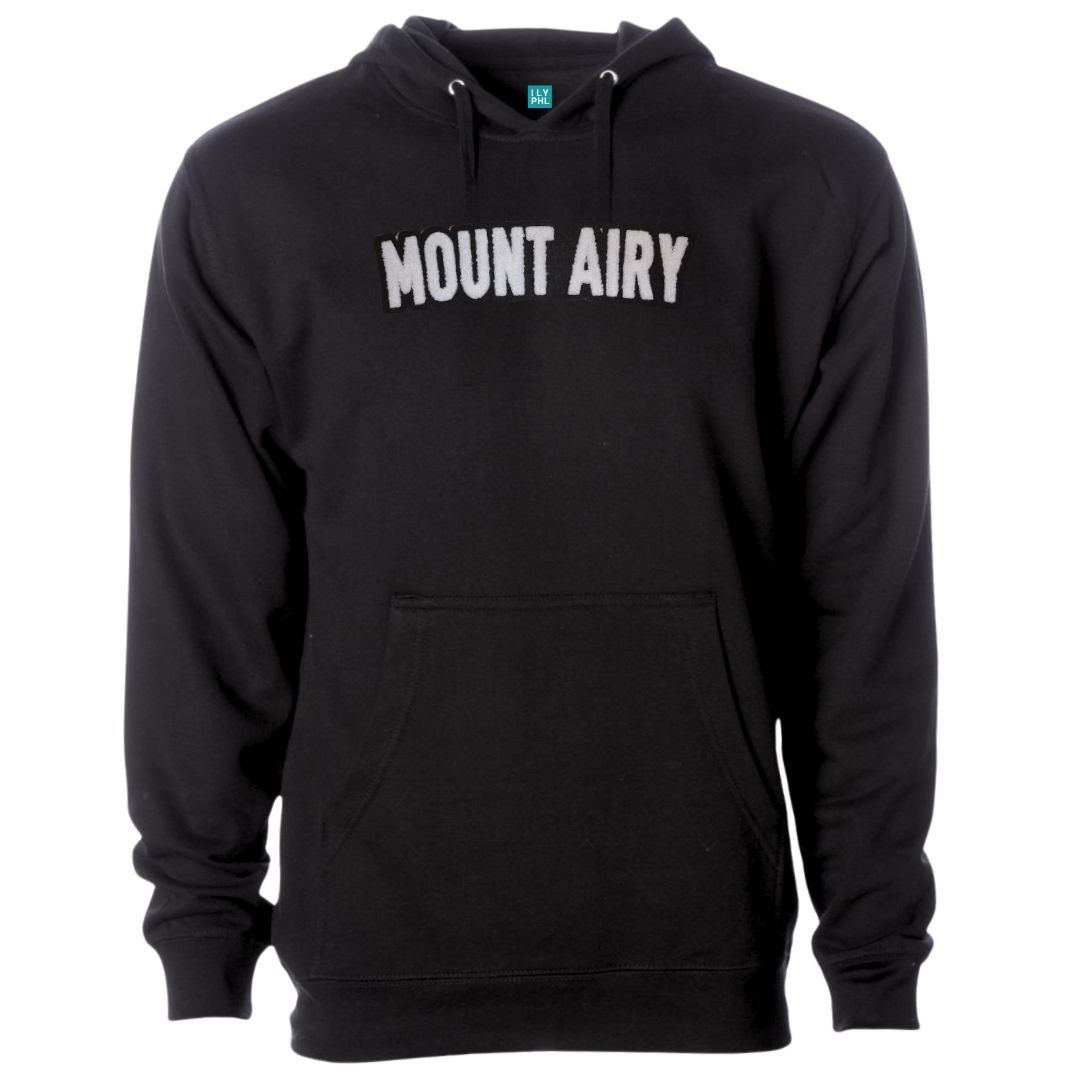 Unisex Black Hooded Sweatshirt with “Mount Airy” in a soft, chenille embroidered patch.
