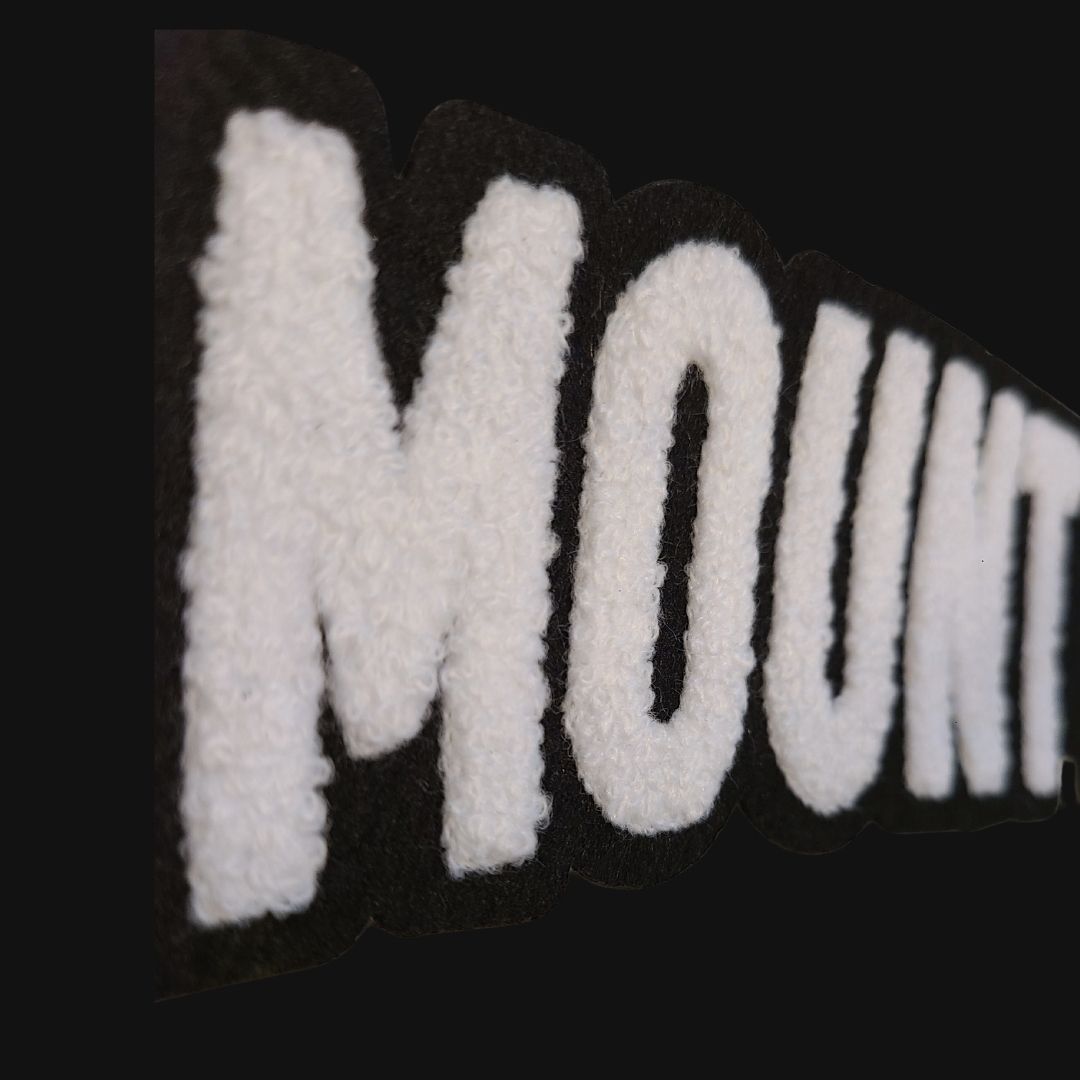 Unisex black crewneck sweatshirt with “Mount Airy” in a soft, chenille embroidered patch.