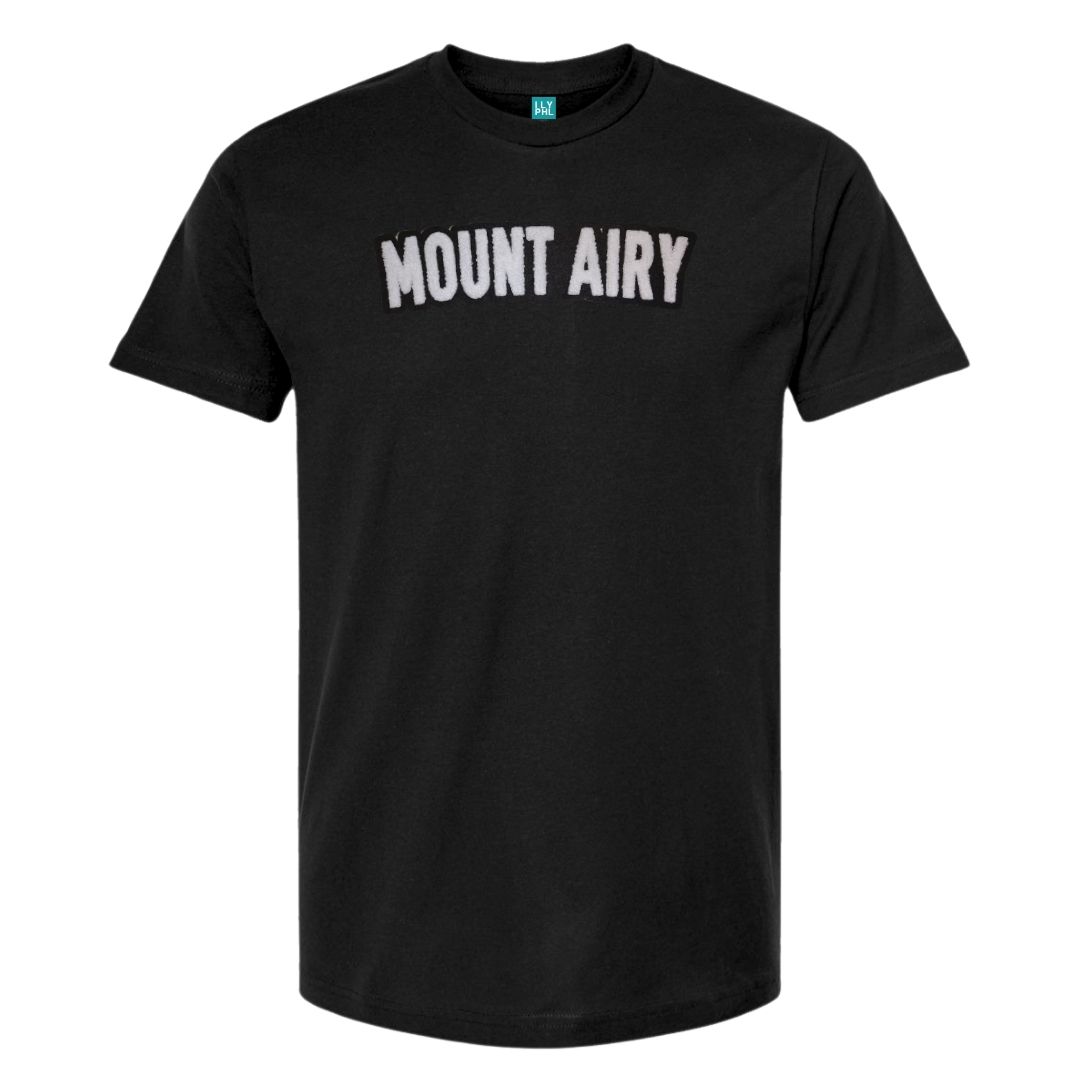 Unisex cut black t-shirt with “Mount Airy” in our standard font on the chest in soft-touch chenille embroidered patch.