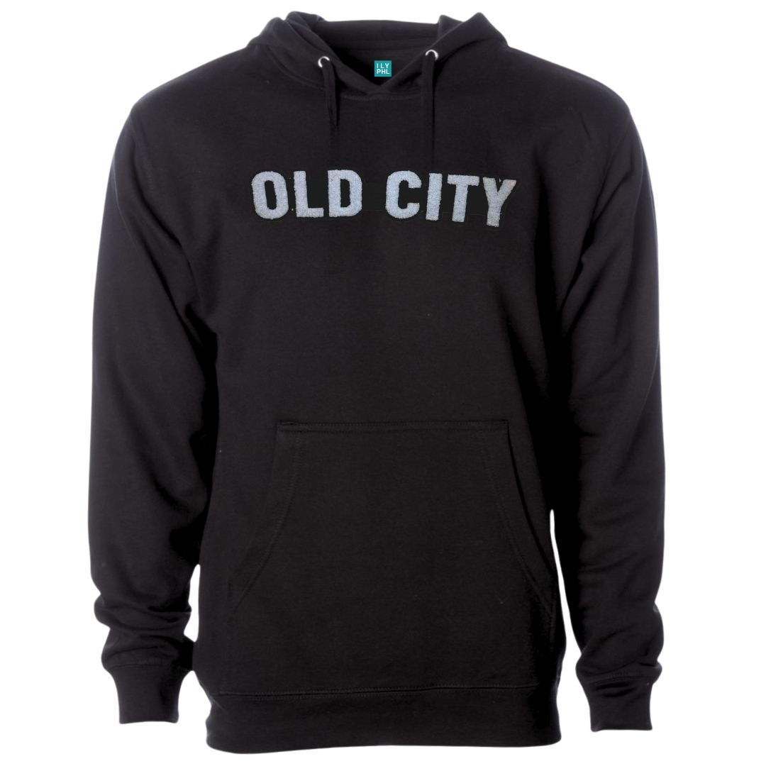 Unisex Black Hooded Sweatshirt with “Old City” in a soft, chenille embroidered patch.