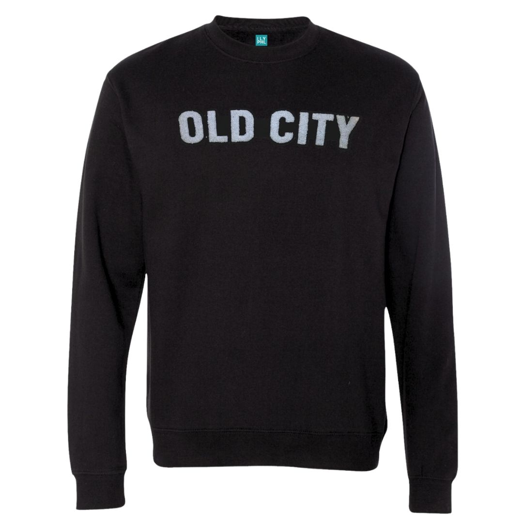 Unisex black crewneck sweatshirt with “Old City” in a soft, chenille embroidered patch.