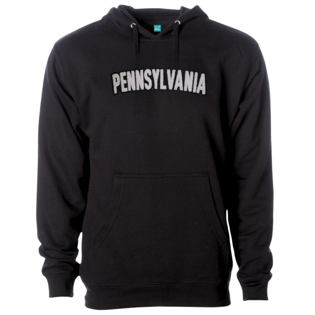 Unisex Black Hooded Sweatshirt with “Pennsylvania” in a soft, chenille embroidered patch.