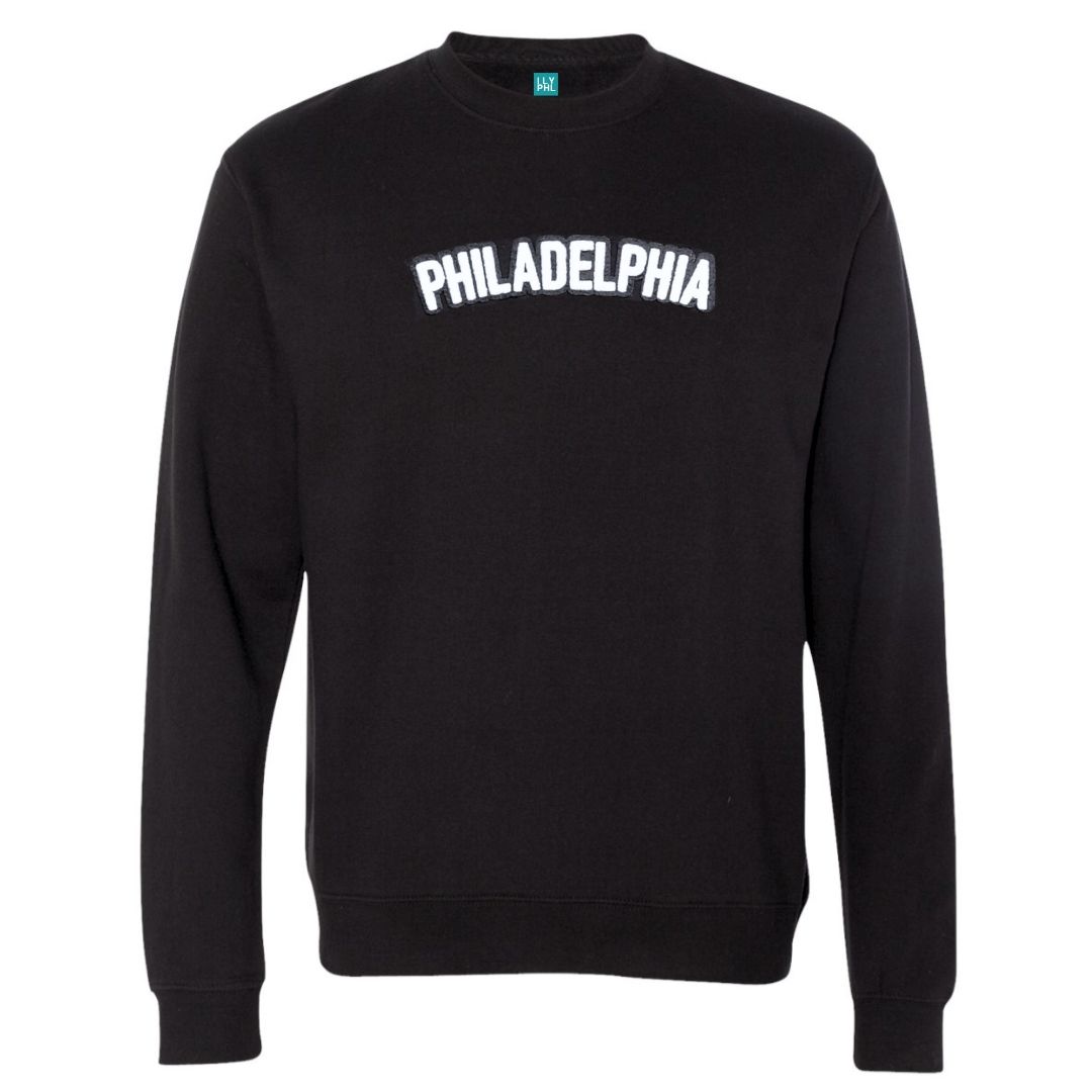 Unisex Black Crewneck Sweatshirt with “Philadelphia” in a soft, chenille embroidered patch.
