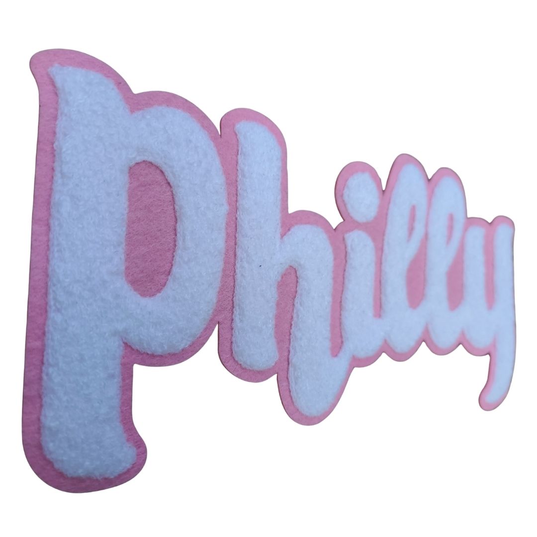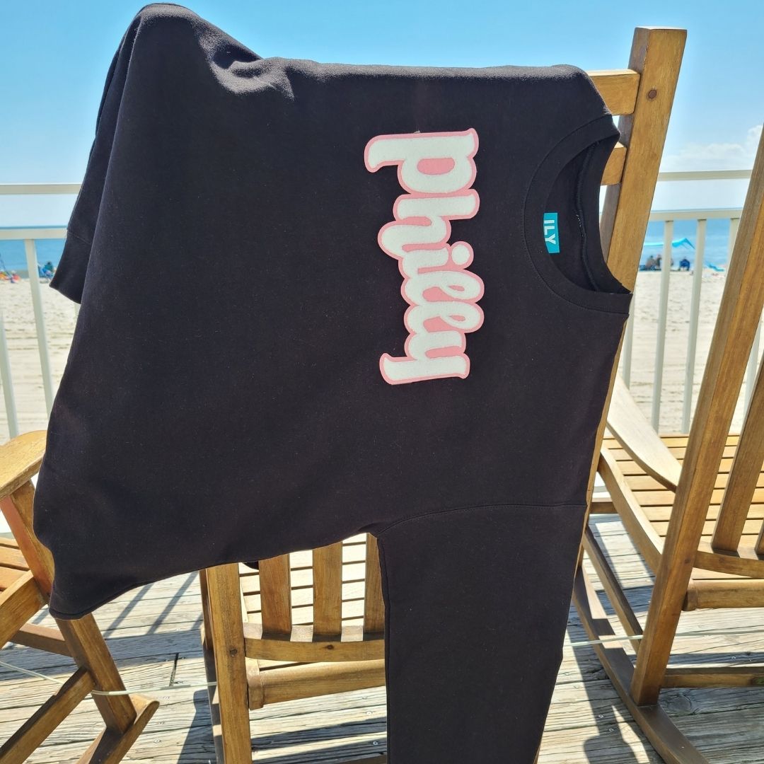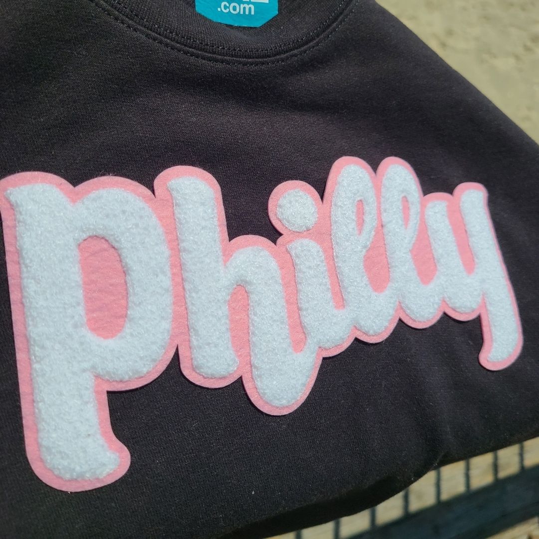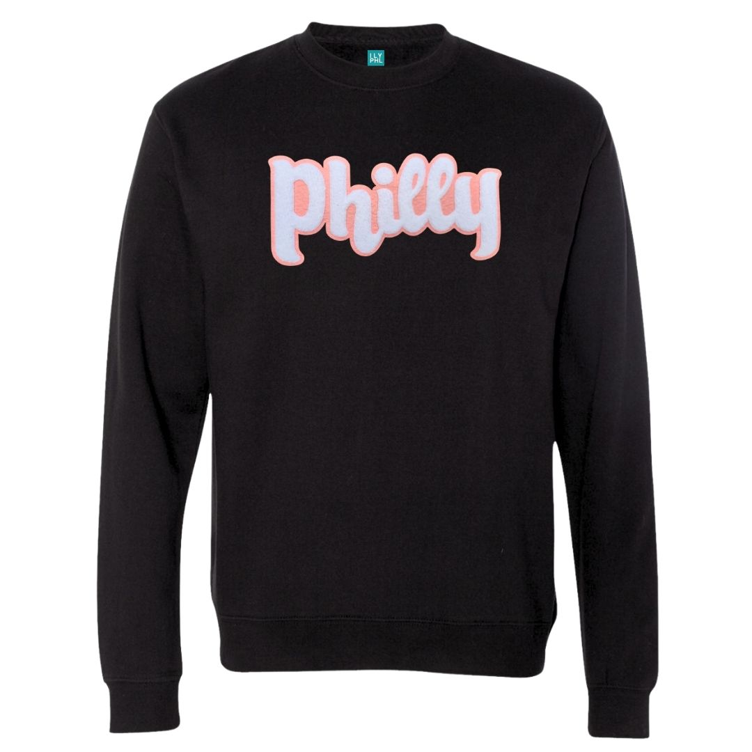 Unisex black crewneck sweatshirt with “Philly” in pink and white a soft, chenille embroidered patch.