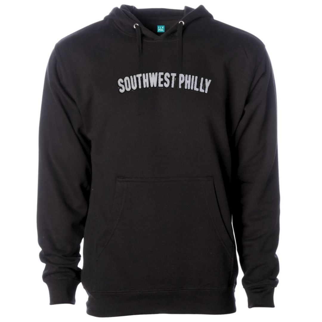 Unisex, midweight, black hooded sweatshirt with a “Southwest Philly”, soft chenille embroidered patch.
