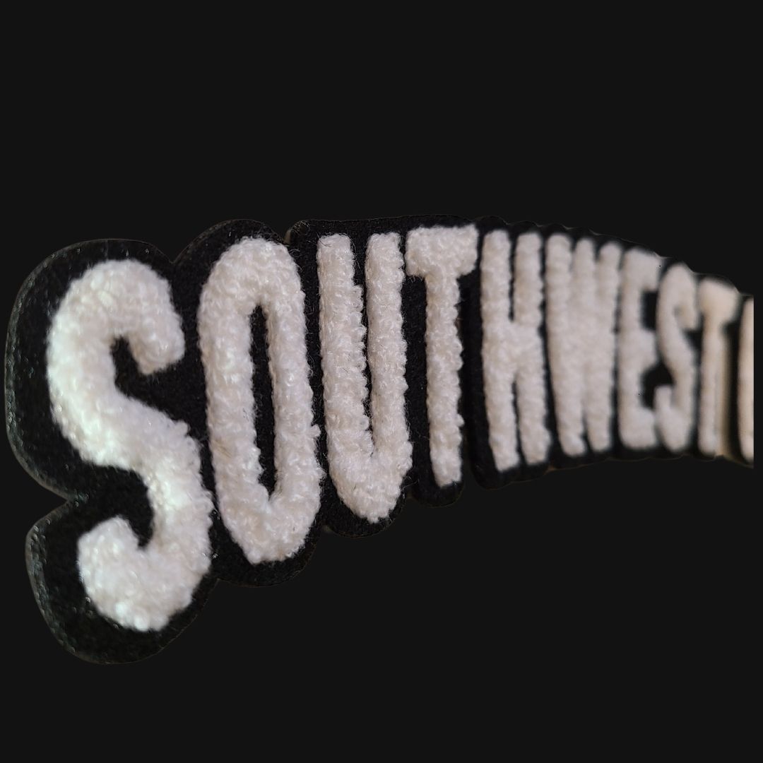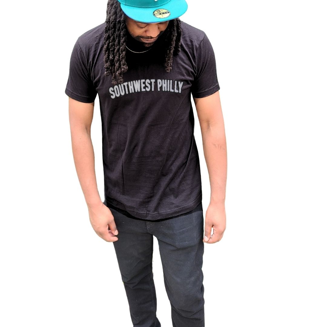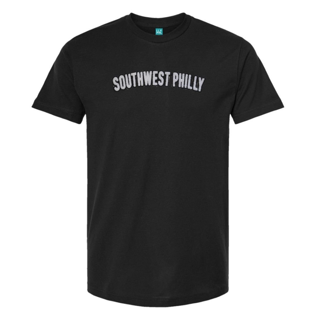 Unisex cut black t-shirt with “Southwest Philly” in our standard font on the chest in soft-touch chenille embroidered patch.