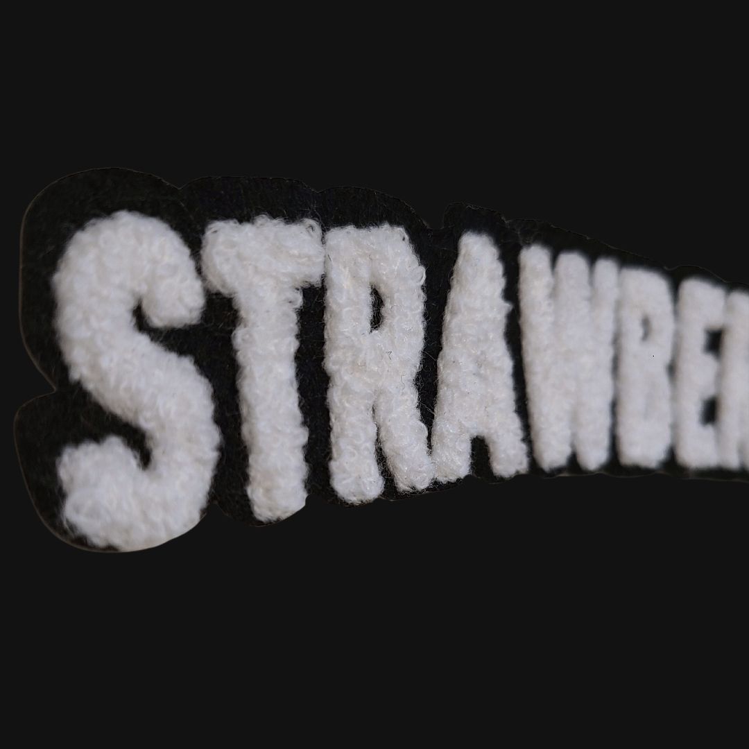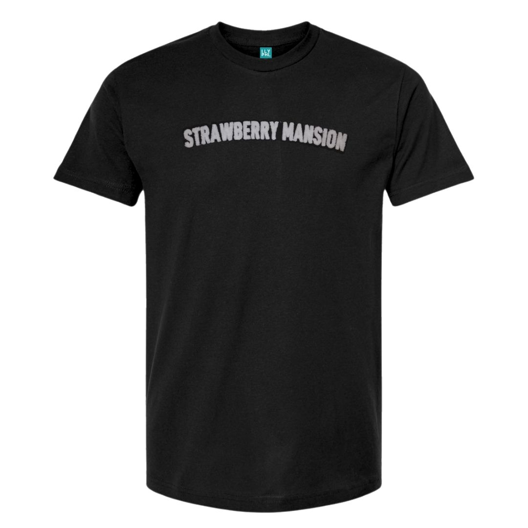 Unisex cut black t-shirt with “Strawberry Mansion” in our standard font on the chest in soft-touch chenille embroidered patch.
