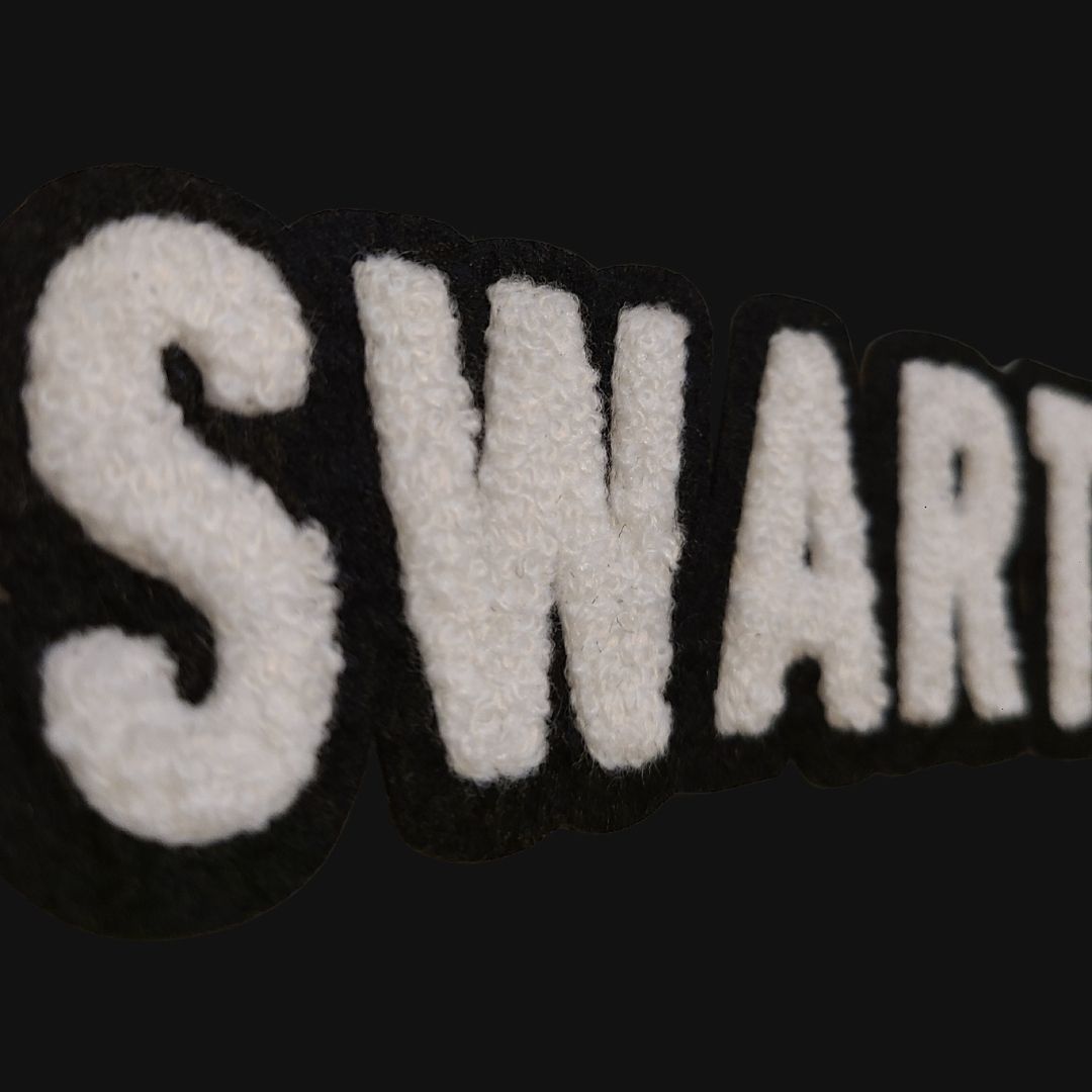 Unisex cut black t-shirt with “Swarthmore” in our standard font on the chest in soft-touch chenille embroidered patch.