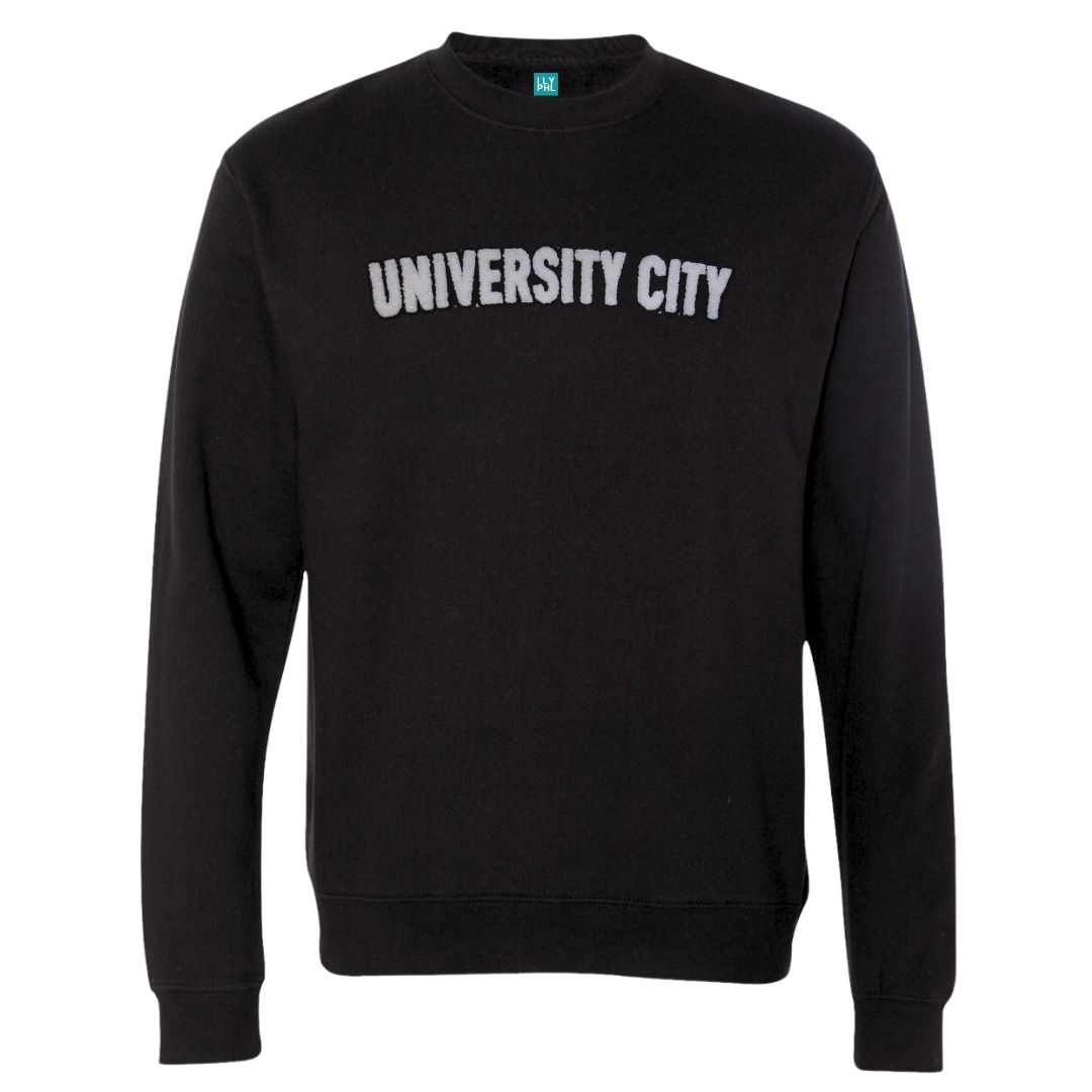 Unisex black crewneck sweatshirt with “University City” in a soft, chenille embroidered patch.